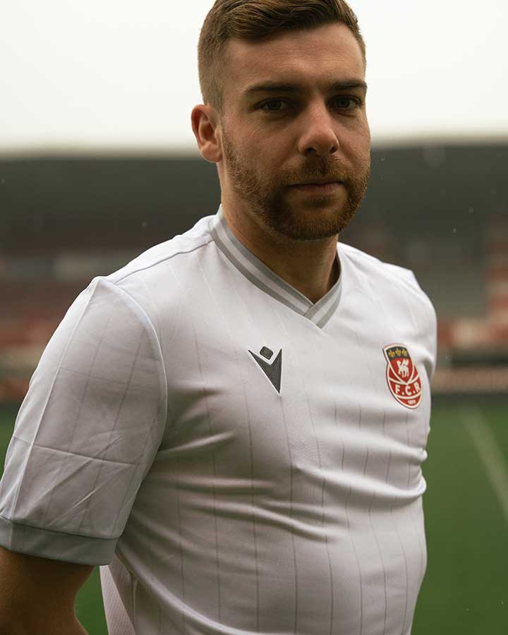 Logos brodés : blason du F.C.R côté cœur, logo Macron sur la poitrine